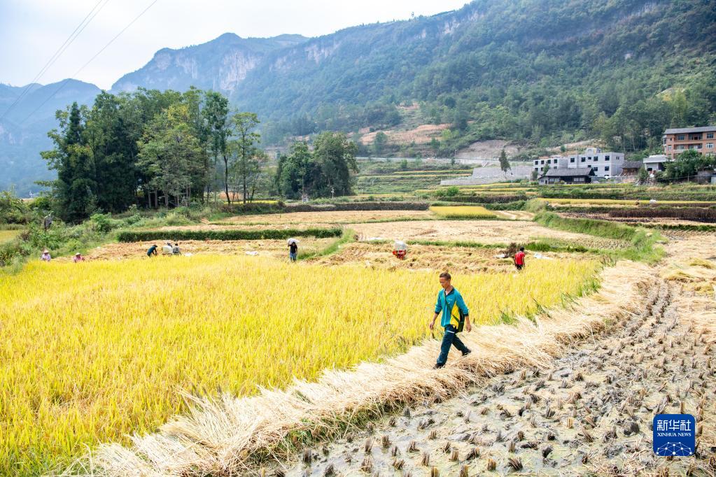 9月15日,投递员张永洪行走在武陵山间的稻田田坎上。新华社记者 唐奕 摄