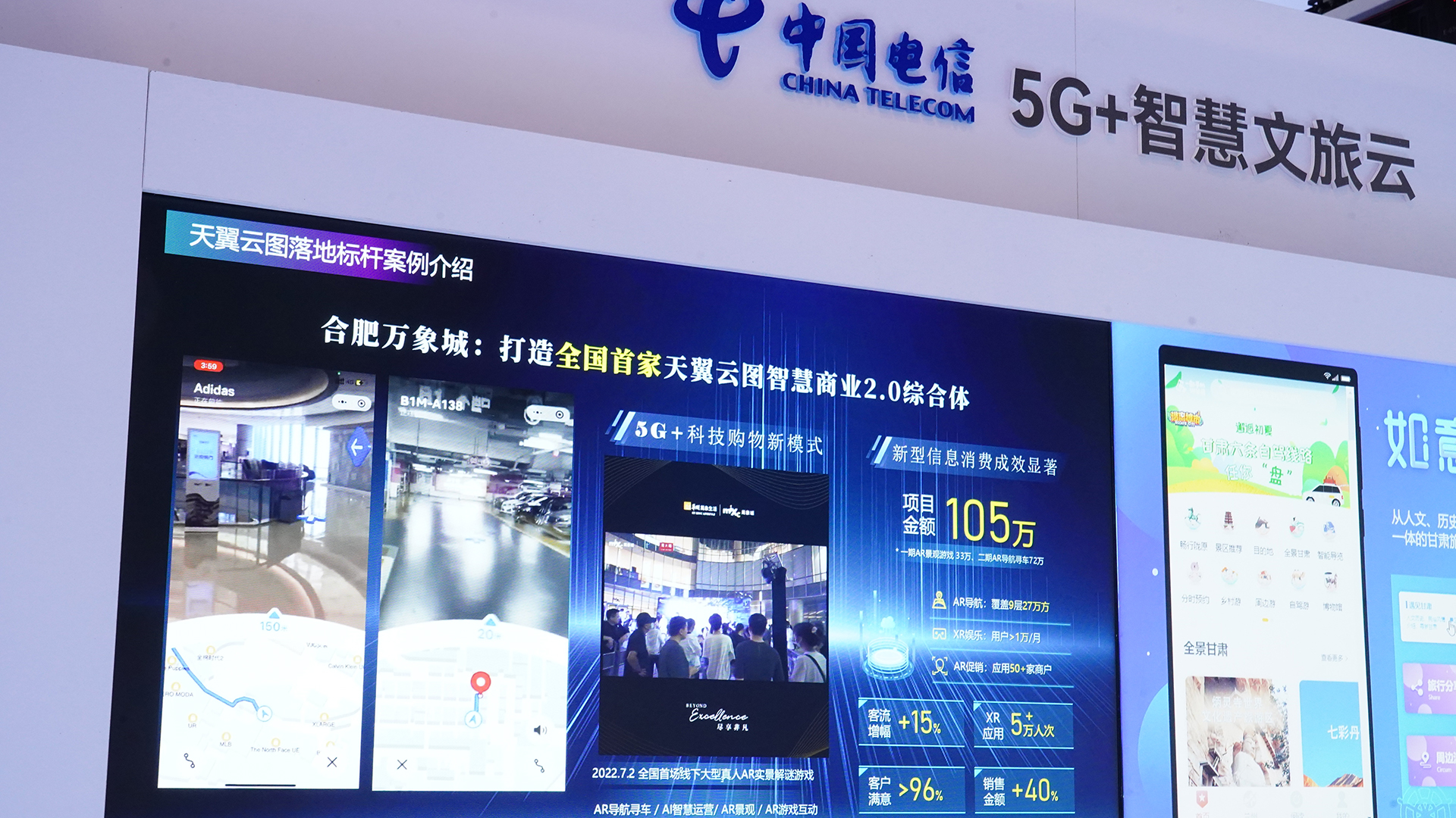 在每一个智慧应用场景板块,都通过不同形式介绍了智慧+的运用。例如,智慧文旅方面,在合肥万象城打造的全国首家天翼云图智慧商业2.0综合体,可通过5G+VR,实现智能寻车、互动体验等功能。
