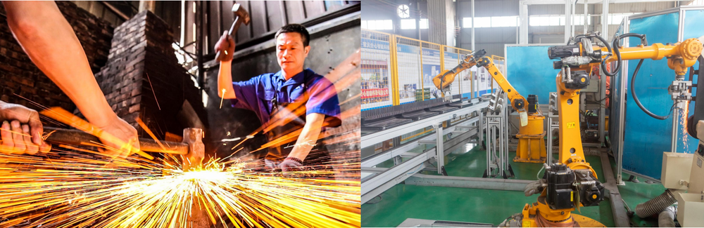 拼版图片:大足“邓家刀”用传统工艺制作菜刀(左);重庆利锋五金有限公司智能化生产车间里,全自动机器人正在对镰刀进行打磨(右)