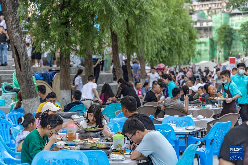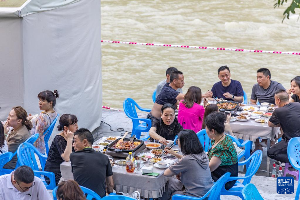 6月19日,在重庆市巫溪县大宁河畔,游客和市民在品尝巫溪烤鱼。新华社记者 黄伟 摄