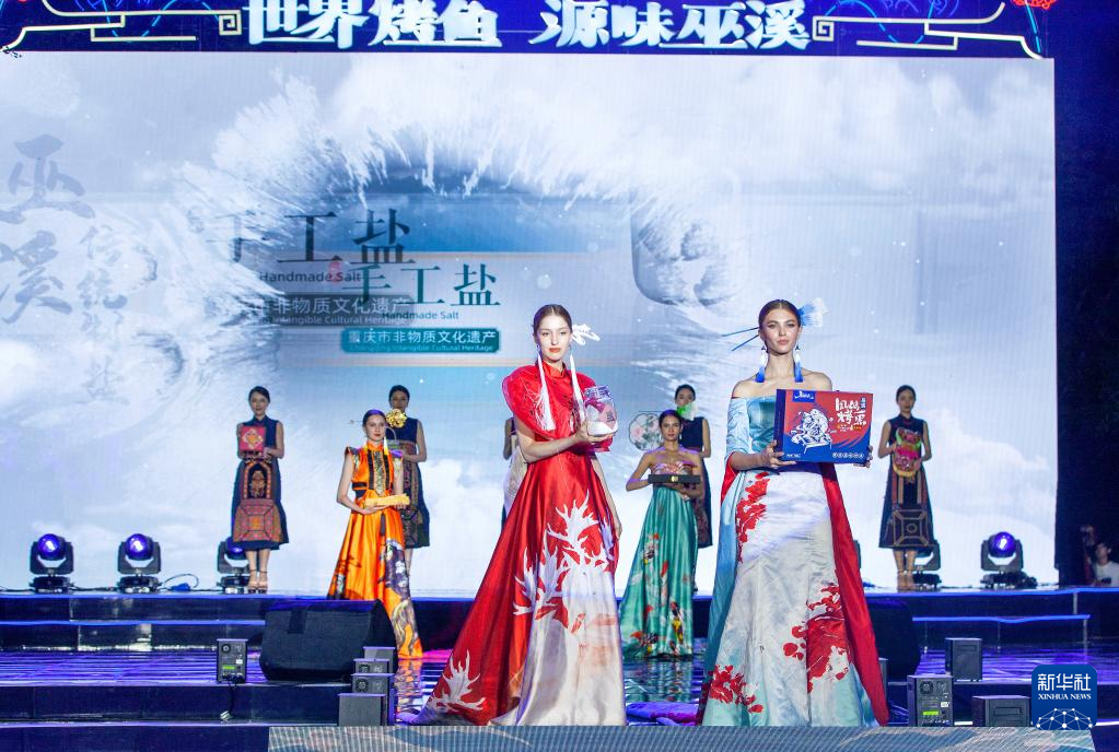 6月19日,工作人员在2023重庆巫溪烤鱼文化节上展示烤鱼预制菜。新华社发(吴丹 摄)