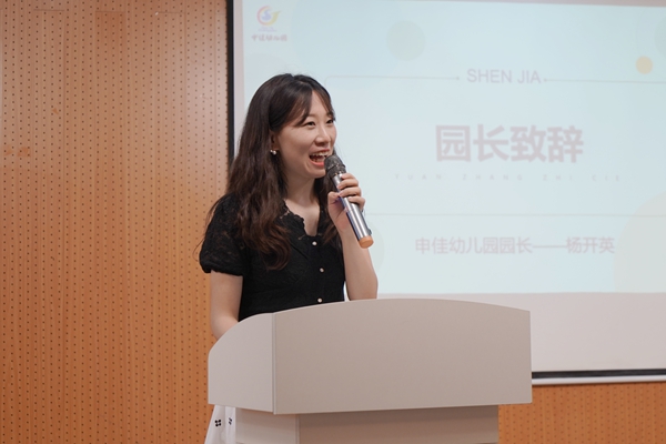 申佳幼儿园园长杨开英在讲话中从“人人参与”“儿童为主”“研磨调整”三个方面分享了早操的具体开展情况。“我们的早操设计听取了幼儿、家长的声音,以‘动’‘玩’‘笑’‘学’为目标。”杨开英介绍,申佳幼儿园的早操活动分为热身运动、队列队形训练、操节训练、体能运动、放松运动五个部分,通过改变早操站位,开发游戏式早操,在早操中留白等方式,让幼儿在跑圈、器械跳操、自由创造式体能活动等项目中快乐运动,达到锻炼身体、提高体能的目的。