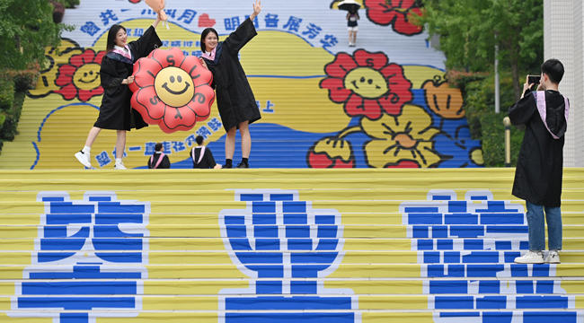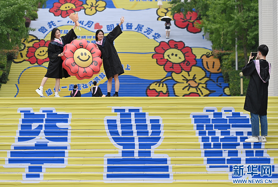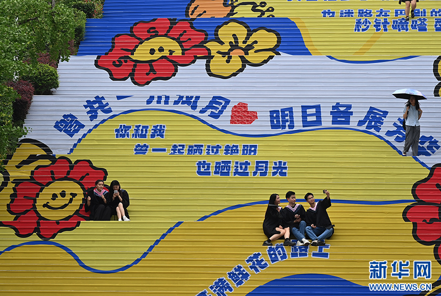 毕业生们在彩绘的求索梯上拍照,定格青春记忆。新华网发(孙凯芳 摄)