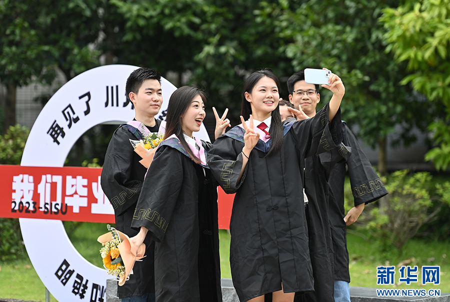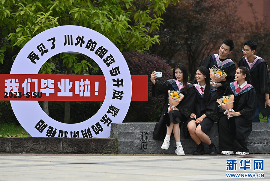 毕业生在校内拍照留影。新华网发(孙凯芳 摄)