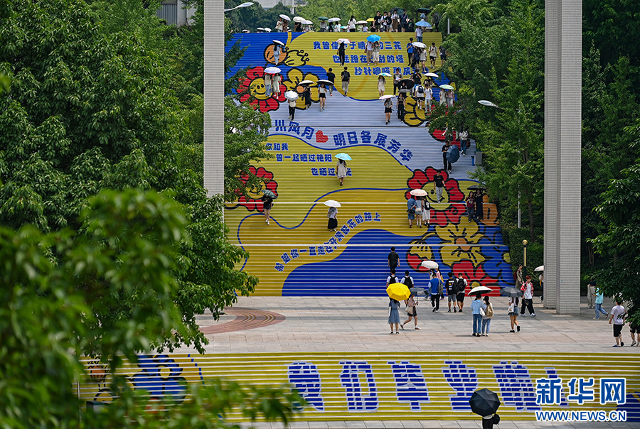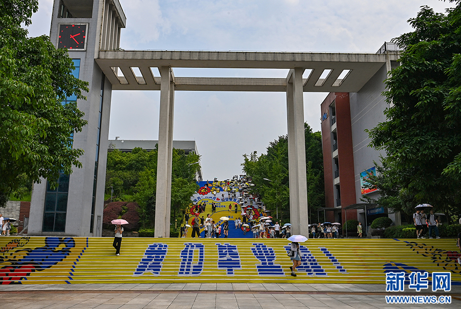 6月20日,在位于重庆市沙坪坝区的四川外国语大学,毕业生在彩绘的求索梯上拍照纪念,今年该校有4000余名毕业学生。新华网发(孙凯芳 摄)