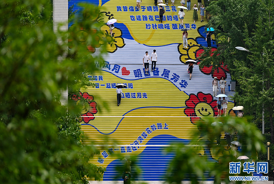 求索梯上绘有毕业献词和川外版歌曲歌词等元素,表达对毕业生的祝福。新华网发(孙凯芳 摄)