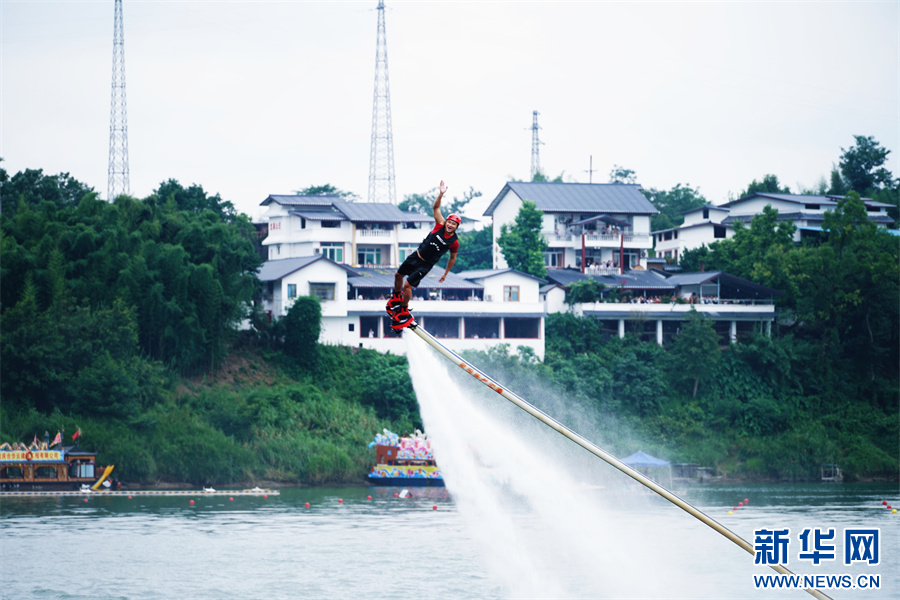 专业水上特技师在江面上,进行水天特技炫酷秀表演。新华网 彭博 摄