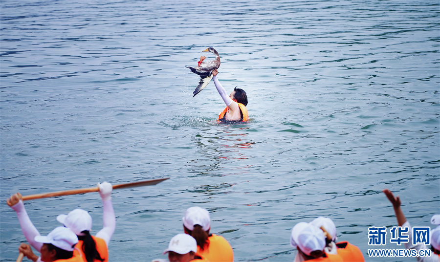 龙舟会传统节目“龙舟抢江”中,花船向江面抛出鸭子、绣球等彩头。龙舟看到彩头后,船上队员下水抢夺。新华网 彭博 摄