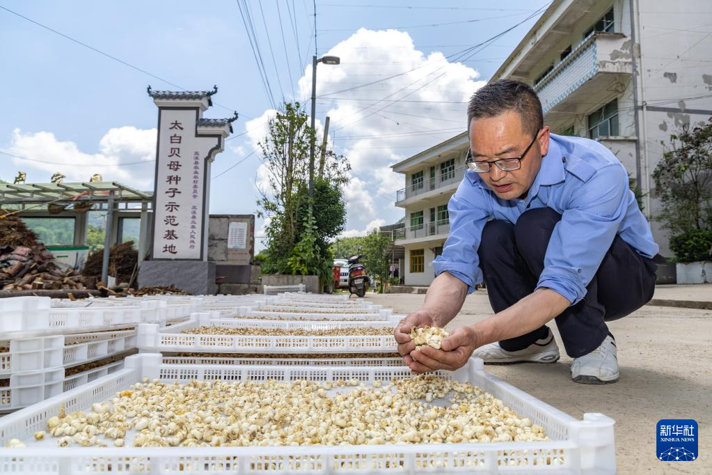 6月26日,在重庆市巫溪县兰英乡西安村,村民在查看烘干后的贝母品质。新华社记者 黄伟 摄