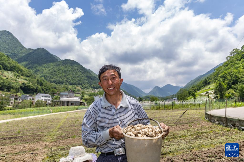6月26日,在重庆市巫溪县兰英乡西安村,村民方孝三在展示刚刚采挖的贝母。新华社记者 黄伟 摄