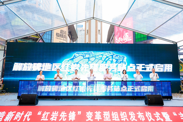 6月29日,在渝中区解放碑打造新时代“红岩先锋”变革型组织发布仪式暨“丰碑之下”首映礼举行,渝中区解放碑与成都春熙路携手,通过政企联动,成立了10支“红岩先锋”变革型组织志愿服务队。