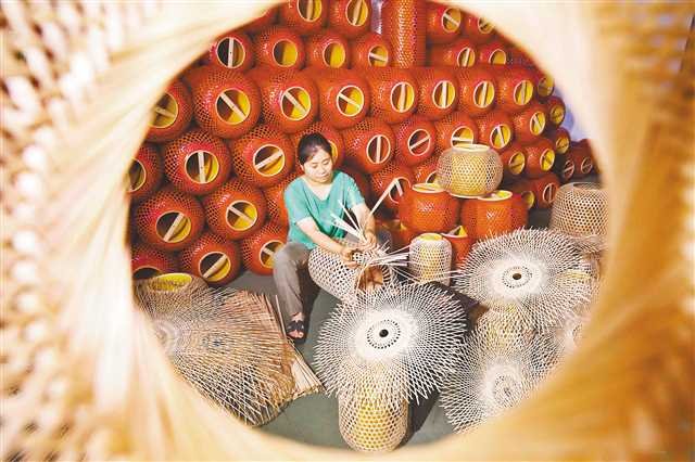 图为6月27日,位于梁平区屏锦镇的一家工厂内,工人在编织仿古灯笼。(特约摄影 刘辉/视觉重庆)