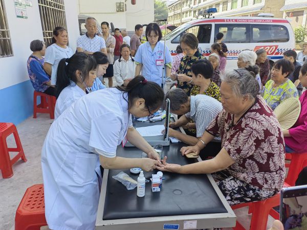 仪式结束后,梁平区袁驿中心卫生院家庭医生签约服务团队为邵兴村村民开展了高血压、糖尿病健康教育和随访活动。活动过程中,医护人员向村民讲解了高血压、糖尿病等疾病的基本知识和卫生健康常识,并对村民进行了血压、血糖测量等多方面的健康体检,让村民切实感受到“家门口”看诊的便捷性,进一步提升了村内居民对健康知识的了解以及自我防护的能力。