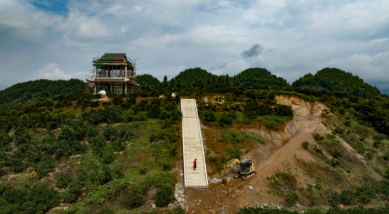 7月24日,在重庆市秀山土家族苗族自治县洪安镇贵措社区拍摄的观景平台施工现场。(胡程 摄)