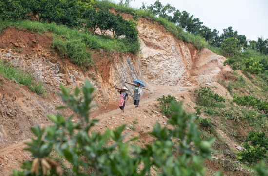 7月24日,在重庆市秀山土家族苗族自治县洪安镇贵措社区,工人们正在搬运建材。(胡程 摄)