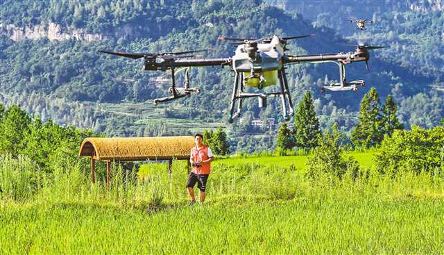 7月22日,万州区恒合土家族乡八一村,无人机穿梭在稻田之间,农技人员在地面作业。无人机可立体式喷洒生物农药,既防病虫害,又能保证生态环境安全。
