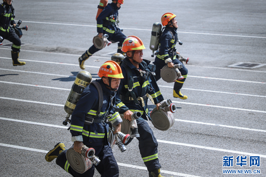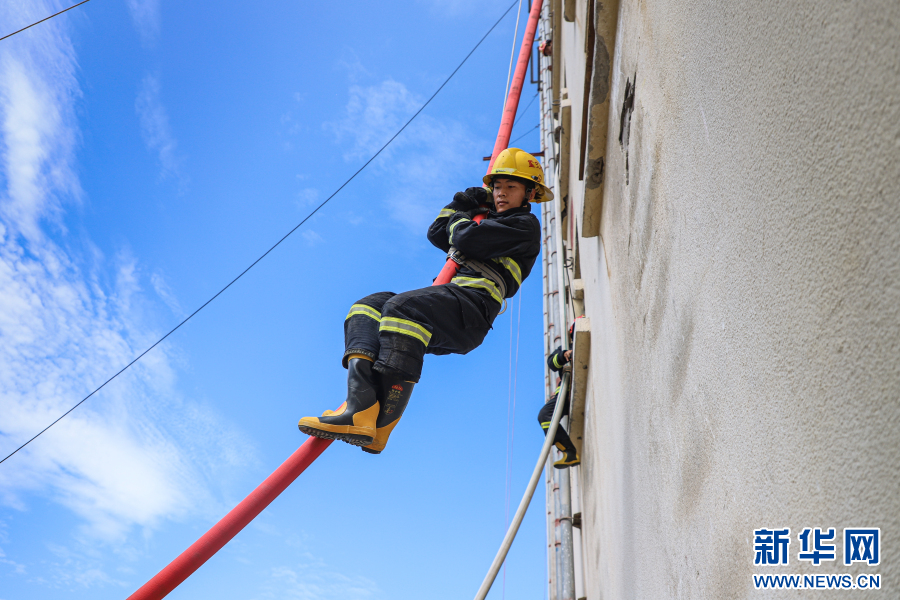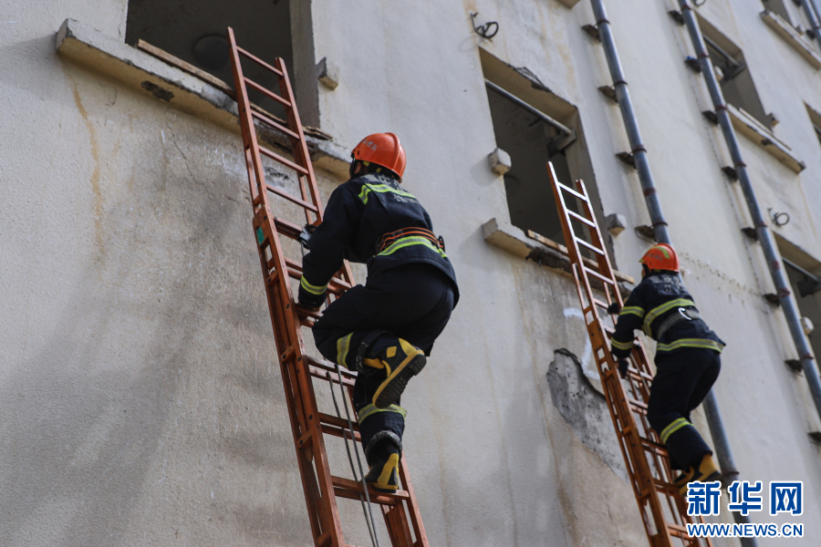 消防员参加原地攀登六米拉梯操课目考核。新华网 发