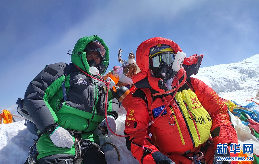 成功登顶珠穆朗玛峰时,张洪(右)与向导合影。新华网发(资料图)