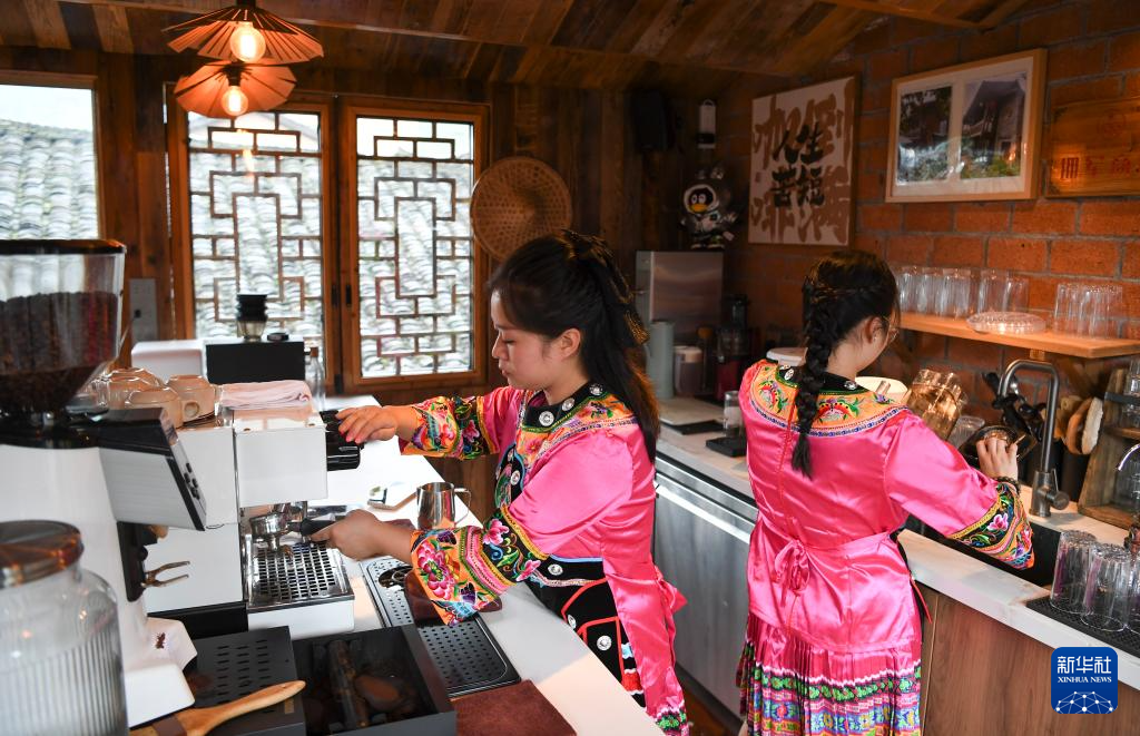 8月20日,酉阳县花田乡何家岩村一家咖啡厅的工作人员在准备饮品。新华社记者 王全超 摄