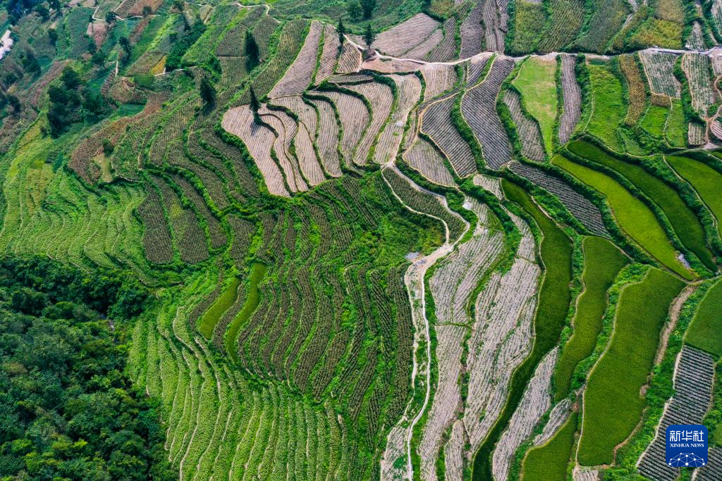8月19日拍摄的酉阳县丁市镇中坝村梯田景观(无人机照片)。新华社记者 王全超 摄