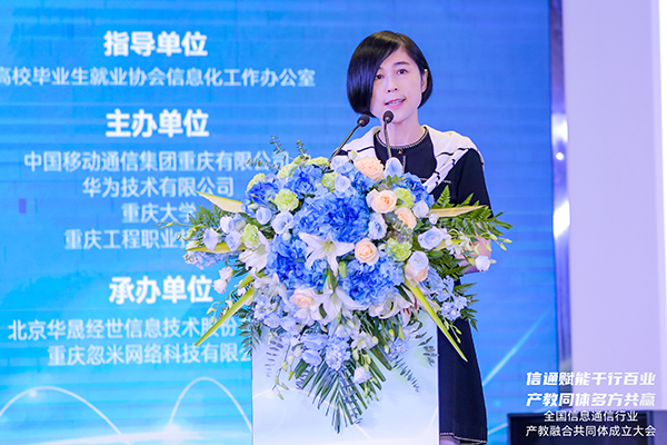 中国移动通信集团重庆有限公司副总经理雷雪梅宣读《全国信息通信行业产教融合共同体成立倡议书》。