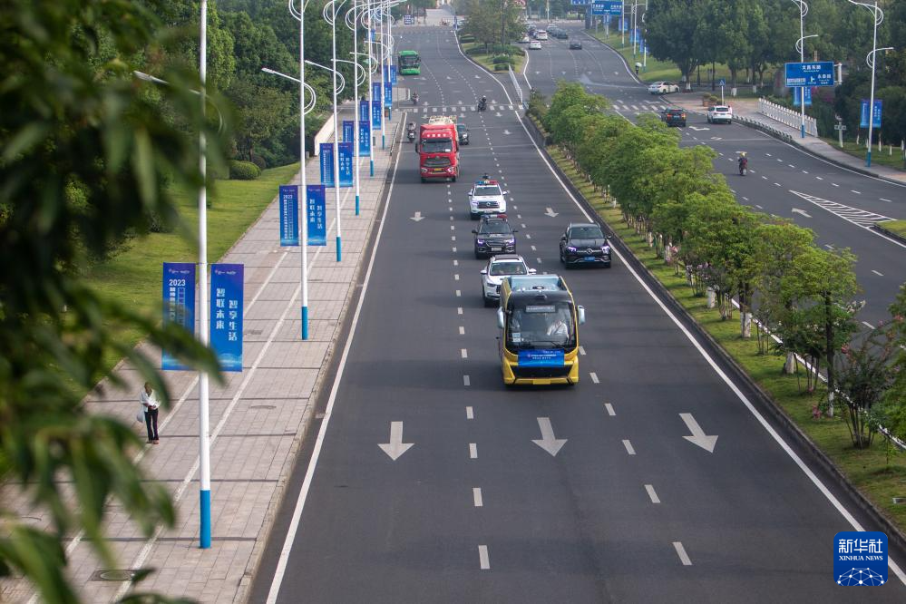 9月2日,在重庆市永川区,参加L3级/L4级自动驾驶公交车组别赛事的车辆从起点出发。