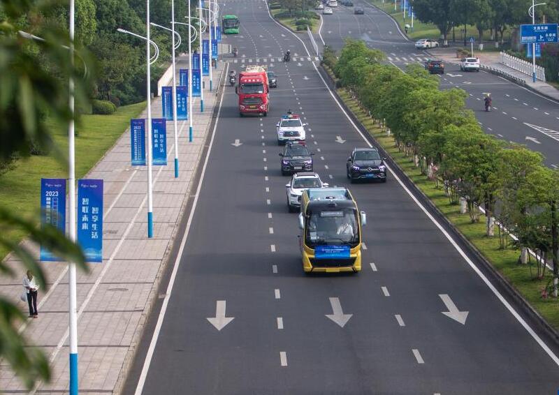 9月2日,在重庆市永川区,参加L3级/L4级自动驾驶公交车组别赛事的车辆行驶在城区道路上。