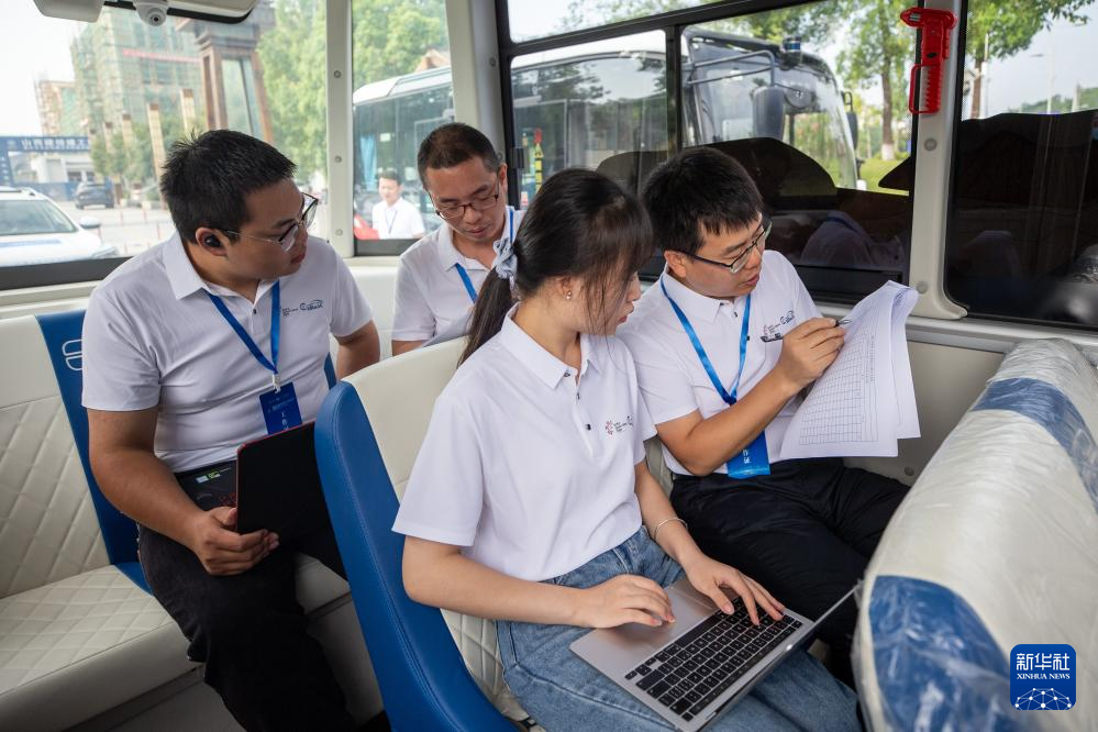 9月2日,在重庆市永川区,裁判在参加L3级/L4级自动驾驶公交车组别赛事的车辆内核对相关信息。