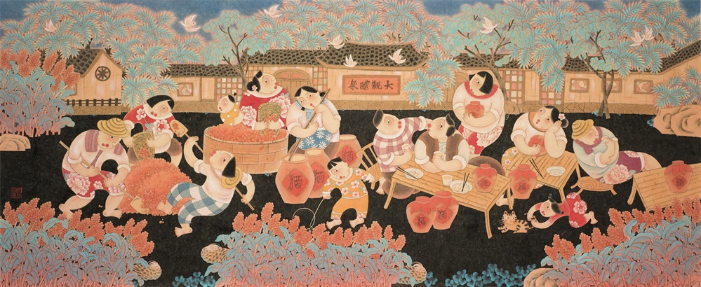 在诸多参展的作品中,梁平区文化馆美术专干郑开琴的年画作品《高粱红了》画出了乡村丰收的盛景。“这是我去梁平区大观镇采风得到的灵感,我从小在梁平农村长大,近些年乡村愈发繁荣,这使我迸发出无穷的创作激情。”郑开琴说。