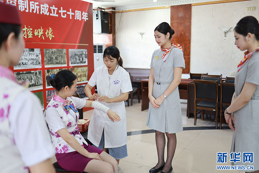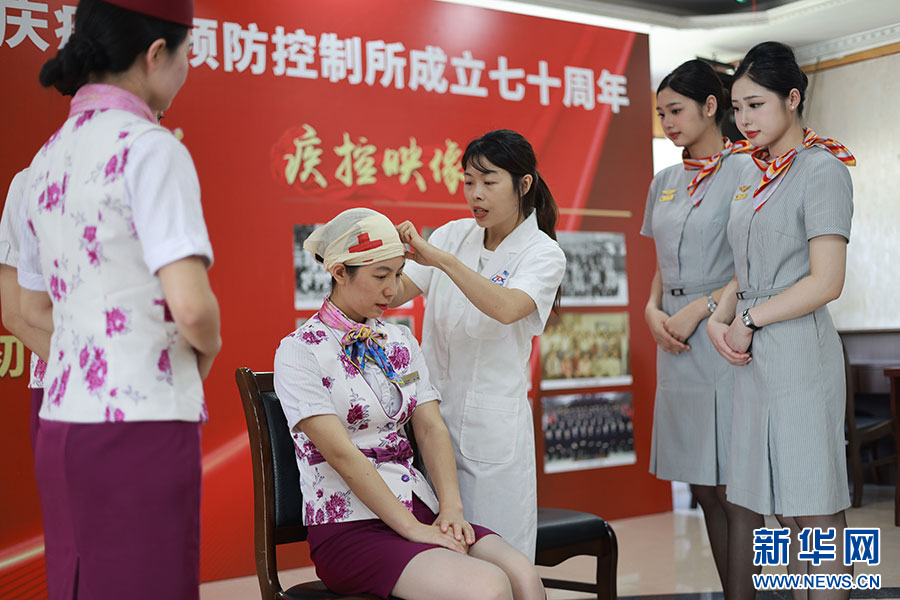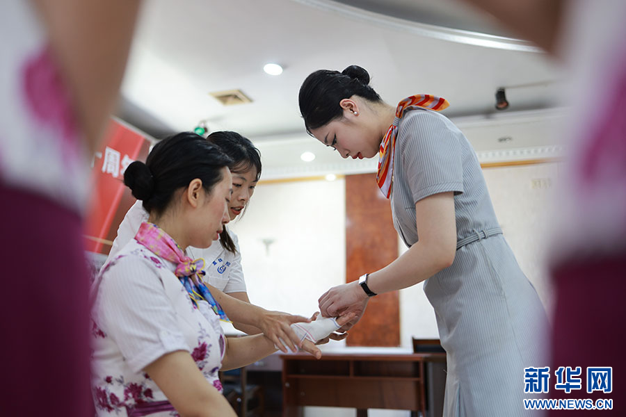 重庆疾病预防控制所医师为乘务人员演示止血包扎。新华网发(苏志刚 摄)