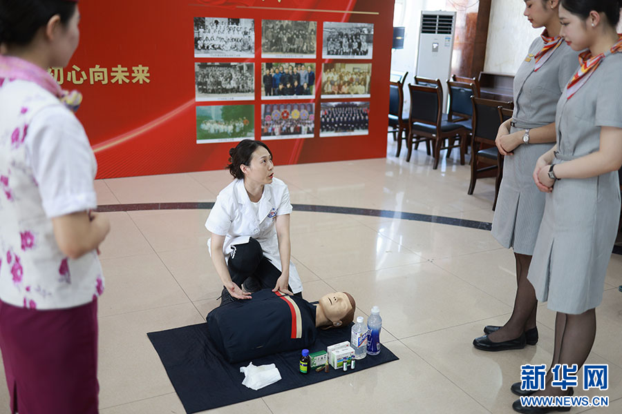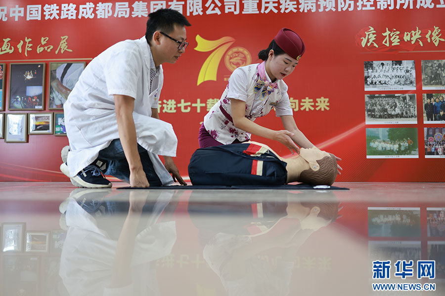 重庆疾病预防控制所医师为乘务人员演示心肺复苏。新华网发(苏志刚 摄)