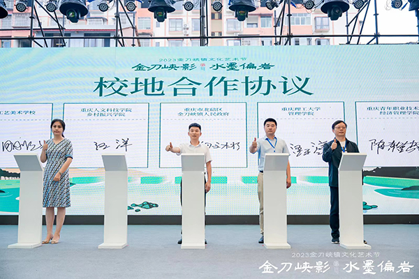 当天,90余名师生共同参加了以“艺术唤醒古镇”为主题的金刀峡镇文化艺术节活动,汪洋与孙丽璐代表重庆理工大学管理学院与金刀峡镇签订了校地合作协议。