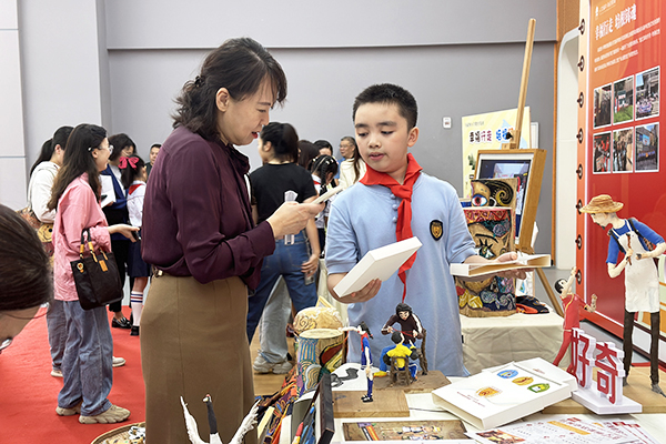 “行走的思政课”育人成果展上,人民小学学生介绍本校思政教育特色和成果。