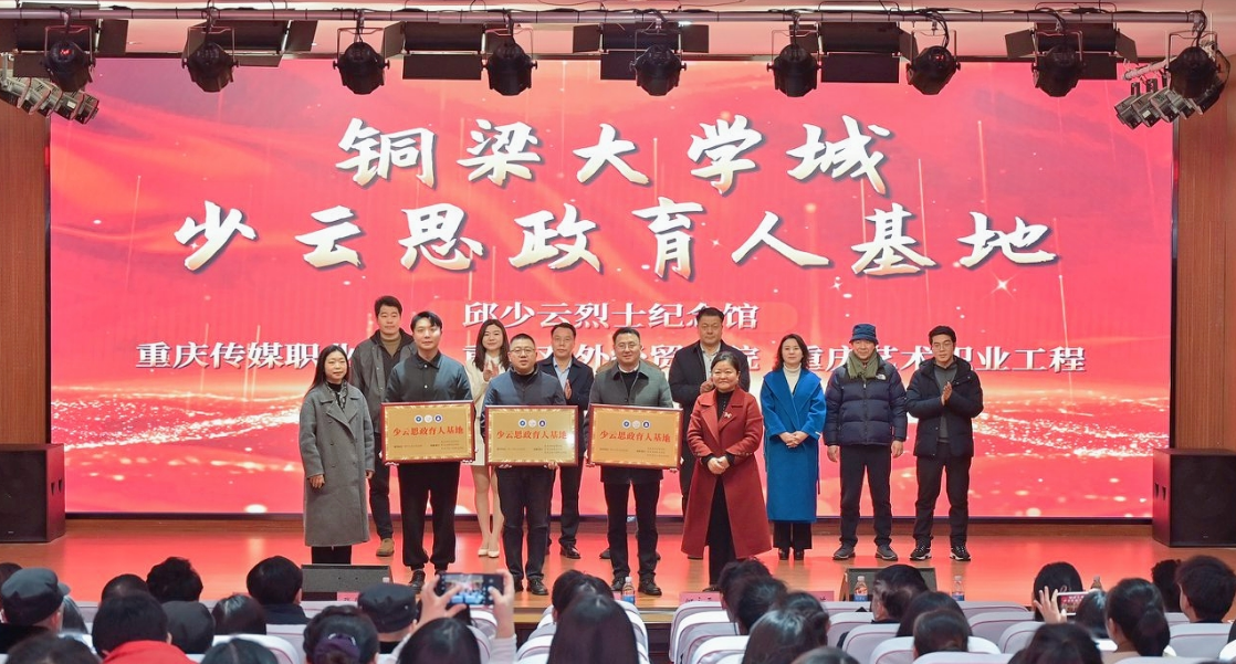 近日,“铜韵启新元·合悦谱华章”2026新年晚会在重庆对外经贸学院铜梁校区举办。晚会期间,一项旨在深化红色基因传承与思想政治教育融合的重要举措落地——在地方教育部门与邱少云烈士纪念馆指导下,重庆对外经贸学院、重庆传媒职业学院、重庆艺术工程职业学院三所高校联合共建的“少云思政育人基地”正式揭牌成立。