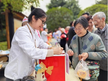 看过了展览不妨来互动游戏区体验一下:“甜蜜糖画铺”摊位的转盘前排起了长队,后面的老人忍不住歪斜着脑袋,想要看清前面的人转出了什么花样的糖画。“超级耍大牌”摊位前的老人们个个摩拳擦掌,用嘴哈气,希望博一个好运气,抽一个大奖。“盲盒总动员”摊位前拼运气开盲盒的老人也是络绎不绝。几个体验游戏下来,忘了拿袋子的李婆婆偷乐着抱怨,“这么多东西怎么拿得回去哦!”