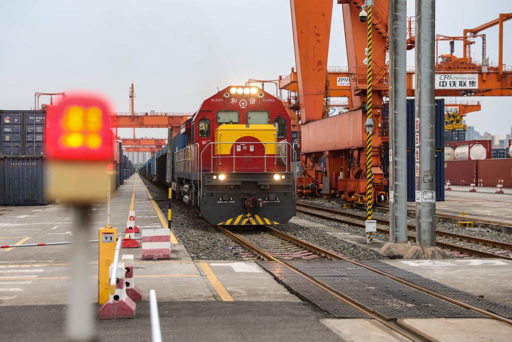 12月8日,重庆市沙坪坝区团结村中心站,一列满载新能源车的中欧班列缓缓驶出,这是本月以来这里发出的第19趟专列。