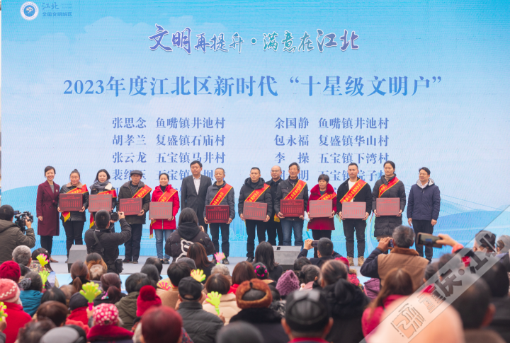 活动在舞蹈表演《绽放》中拉开序幕。活动现场,“小江说文明”宣讲员胡婷、郭静和复盛镇庙坝社区党总支副书记聂媛,分别以《文明江北 你我同行》《千年文明里的自信与特色》和《我眼中的复盛》为题,用风趣幽默、通俗易懂的语言,为大家普及了文明出行、文明用餐、移风易俗等相关知识。并为2023年度江北区新时代“十星级文明户”进行了授牌。