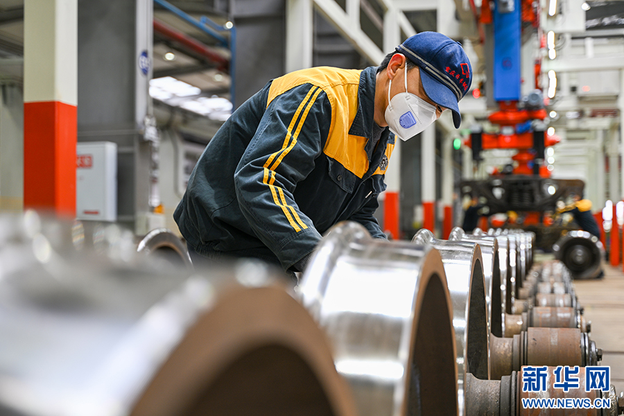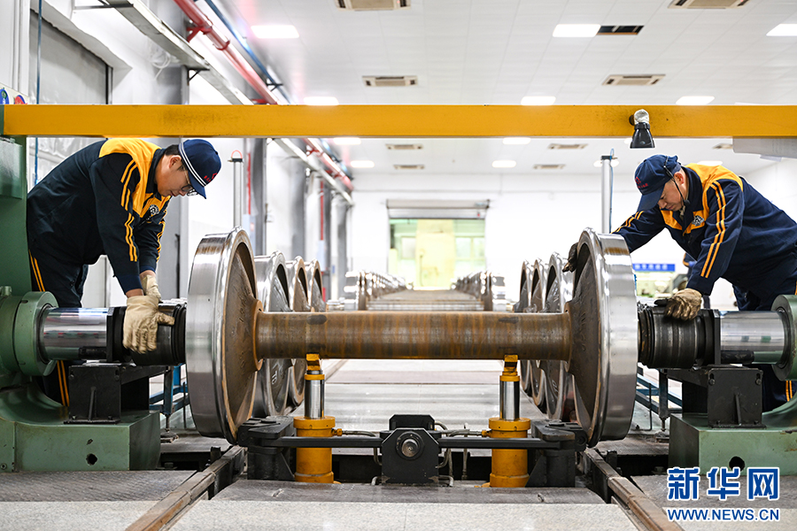 中国铁路成都局集团有限公司重庆西车辆段轮轴装修工正在进行轮对轴承压装作业。新华网发(刘彪 摄)