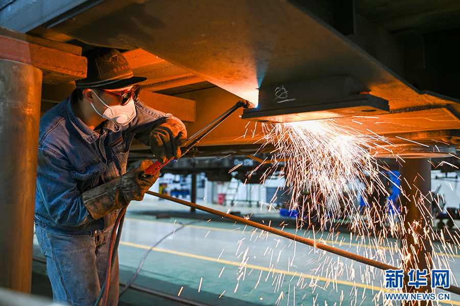 中国铁路成都局集团有限公司重庆西车辆段熔接工正在对车体底架进行焊接作业。新华网发(刘彪 摄)
