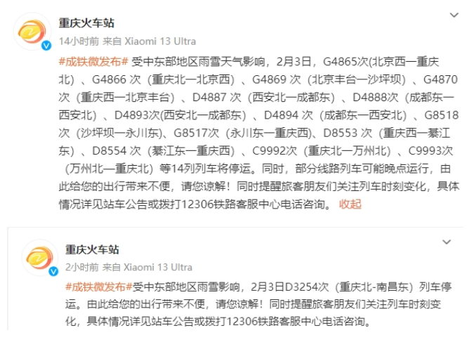 据@重庆火车站消息,受中东部地区雨雪天气影响,2月3日,受降雪影响,部分旅客列车停运。