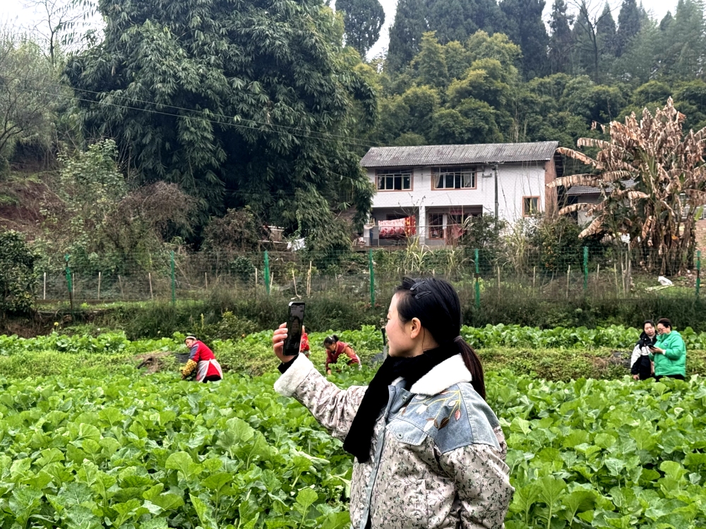 大足区回龙镇幸福村,助农主播正在为油菜苔带货。受访单位供图