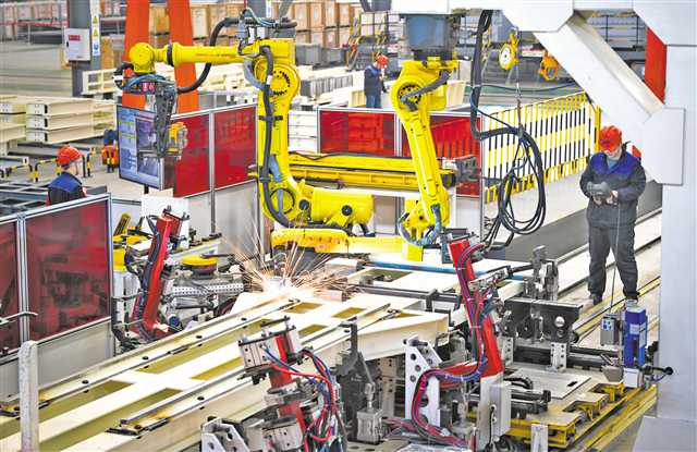 2月20日,大渡口区建桥园区,重庆三峰卡万塔环境产业有限公司生产车间智能焊接生产线上,焊接机器人正高效运行,对垃圾焚烧炉进行组装焊接,现场一片火热的生产景象。