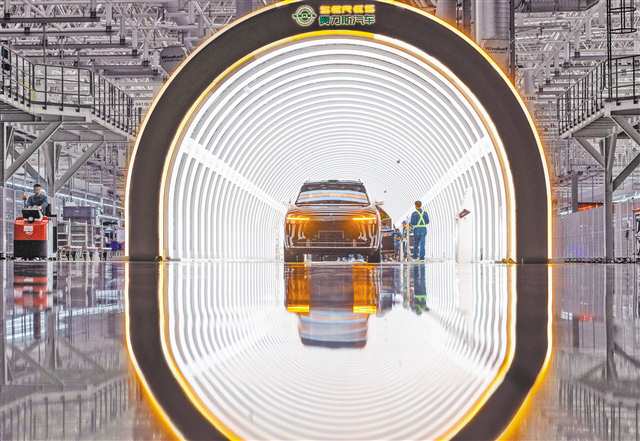 4月8日,两江新区龙盛新城赛力斯汽车超级工厂,工人们在下线质量门处对车辆进行检查。作为全球标杆数字化工厂,该工厂拥有超过1000台智能化设备,最快30秒可下线一台新能源汽车。记者 张锦辉 摄/视觉重庆