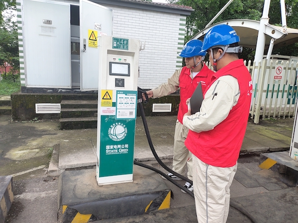 电力工人正在检查充电桩。(国网重庆北碚供电公司供图)