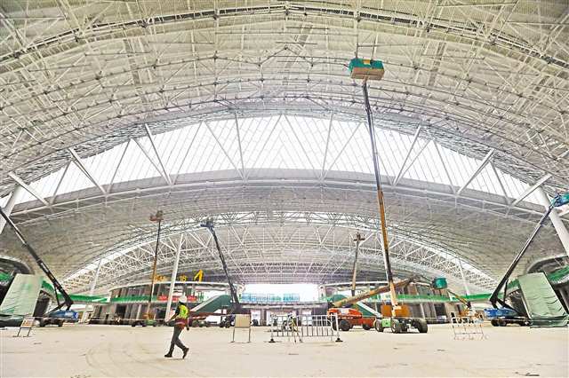 连日来,重庆江北国际机场T3B航站楼内一派繁忙,中建八局的技术工人正在进行吊顶施工。