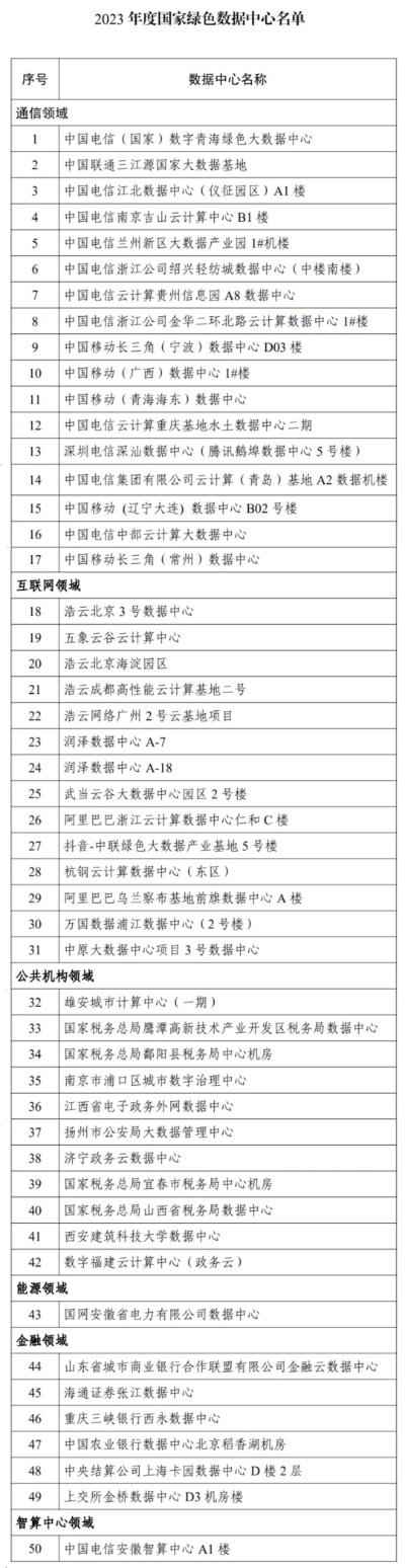 名单显示,国家绿色数据中心涉及六大领域,包括通讯领域17家、互联网领域14家、公共机构领域11家、能源领域1家、金融领域6家、智算中心领域1家。