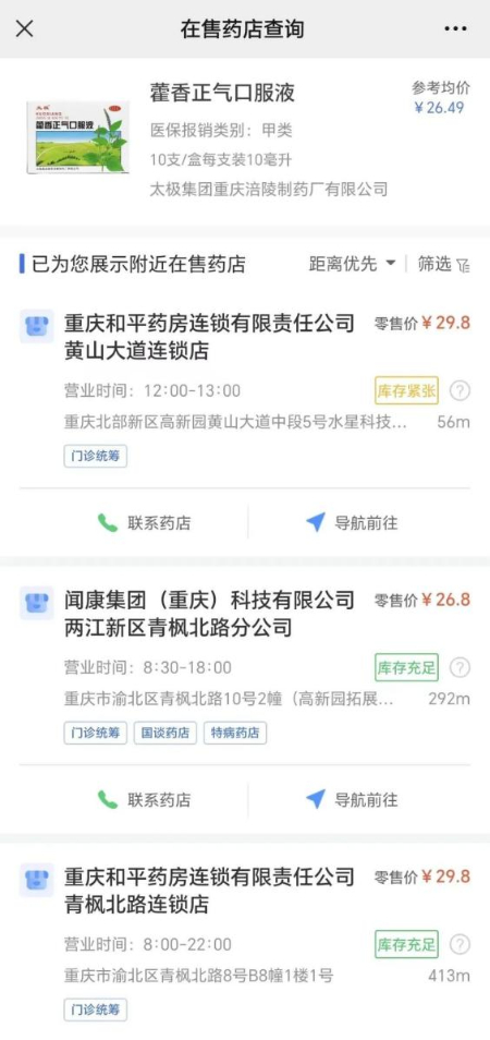 第四步:输入药品名称,即可查询药品规格信息、库存状态、销售价格及参考均价,全市在售药店数量、营业时间及地址信息。可按距离或价格优先排序展示,市民可联系药店咨询购药事宜或按地图导航到店购药。