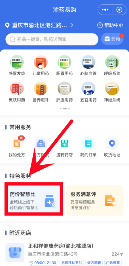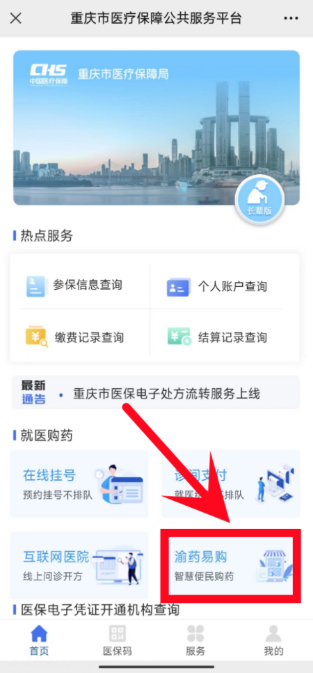 第二步:在“就医购药”栏目选择“渝药易购”服务。
