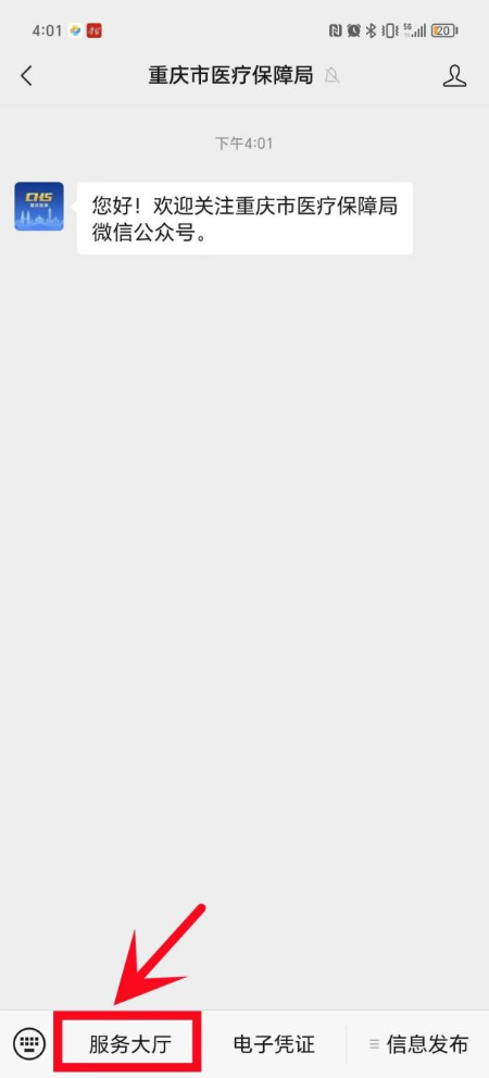 第一步:关注“重庆市医疗保障局”微信公众号,点击“服务大厅”。