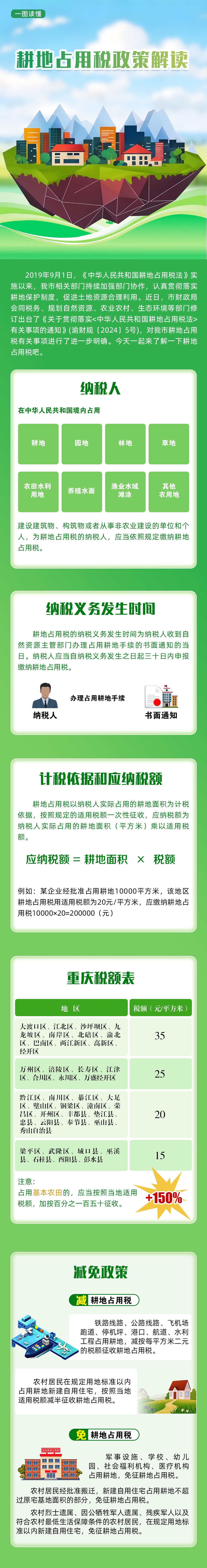 近日,重庆市财政局会同税务、规划自然资源、农业农村、生态环境等部门修订出台了《关于贯彻落实<中华人民共和国耕地占用税法>有关事项的通知》,对重庆耕地占用税有关事项进行了进一步明确。